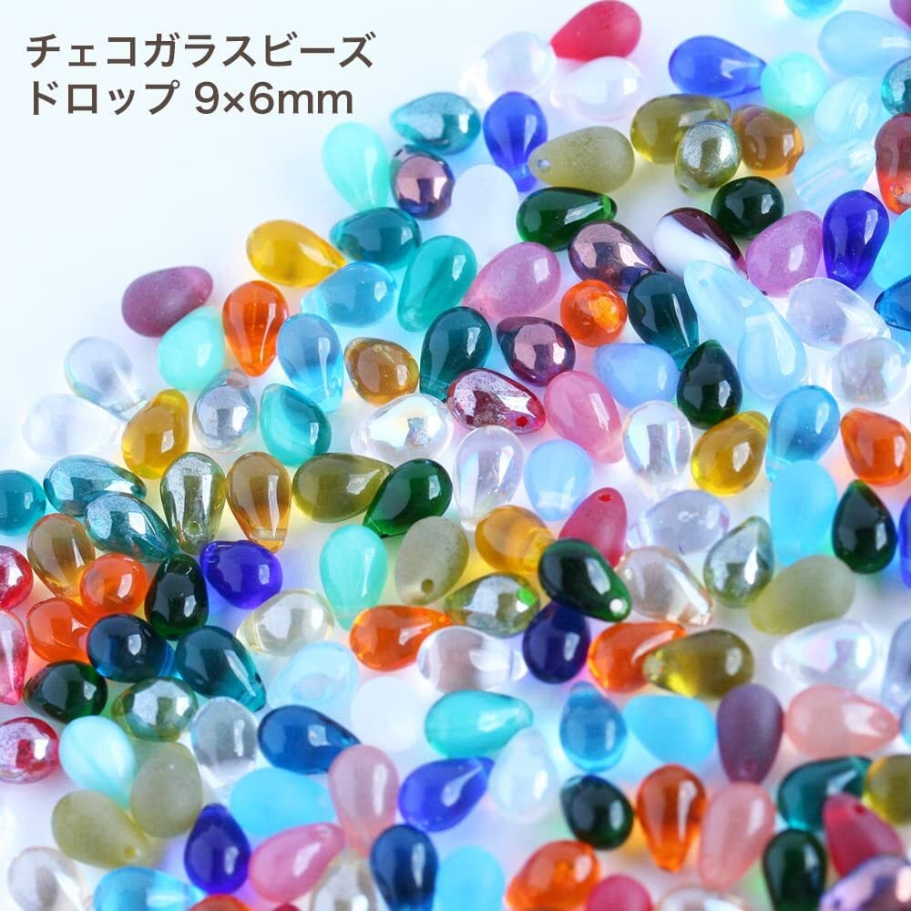 チェコガラスビーズのドロップ9×6mmおよそ100個をランダムカラーでセットにしたアソート商品