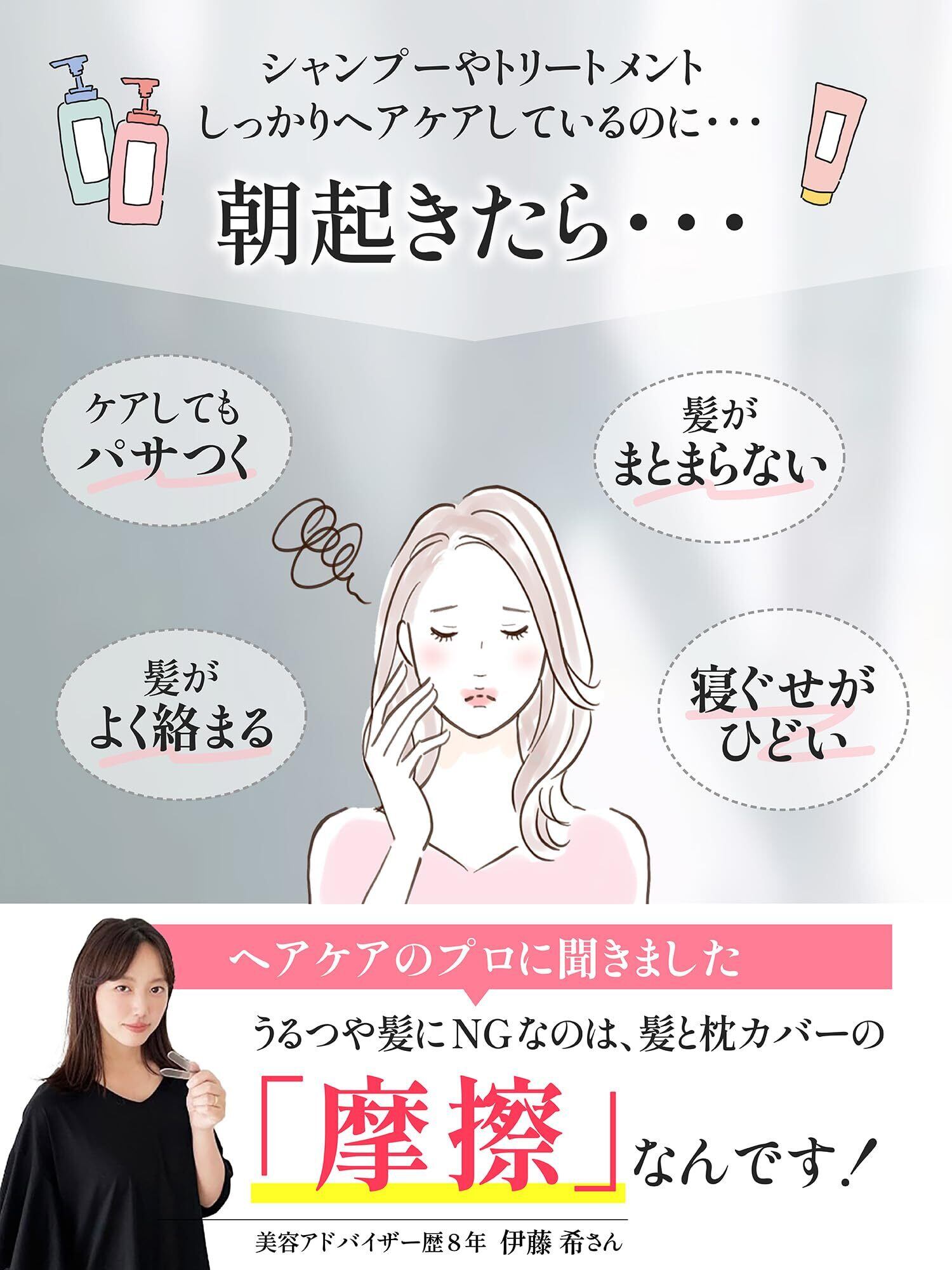 【寝ながらヘアケア】シルク枕カバーに含まれるタンパク質は、枝毛・縮毛・曲がり・乾燥を最小限に抑え、髪と髪の摩擦を軽減する効果があります。シルク枕カバーは長く使っていくうちに、髪が段々柔らかく滑らかになって光沢がでてきたりと髪質改善を実感できます。睡眠中のヘアケアアイテムとして、シルク枕カバーは大人気です。