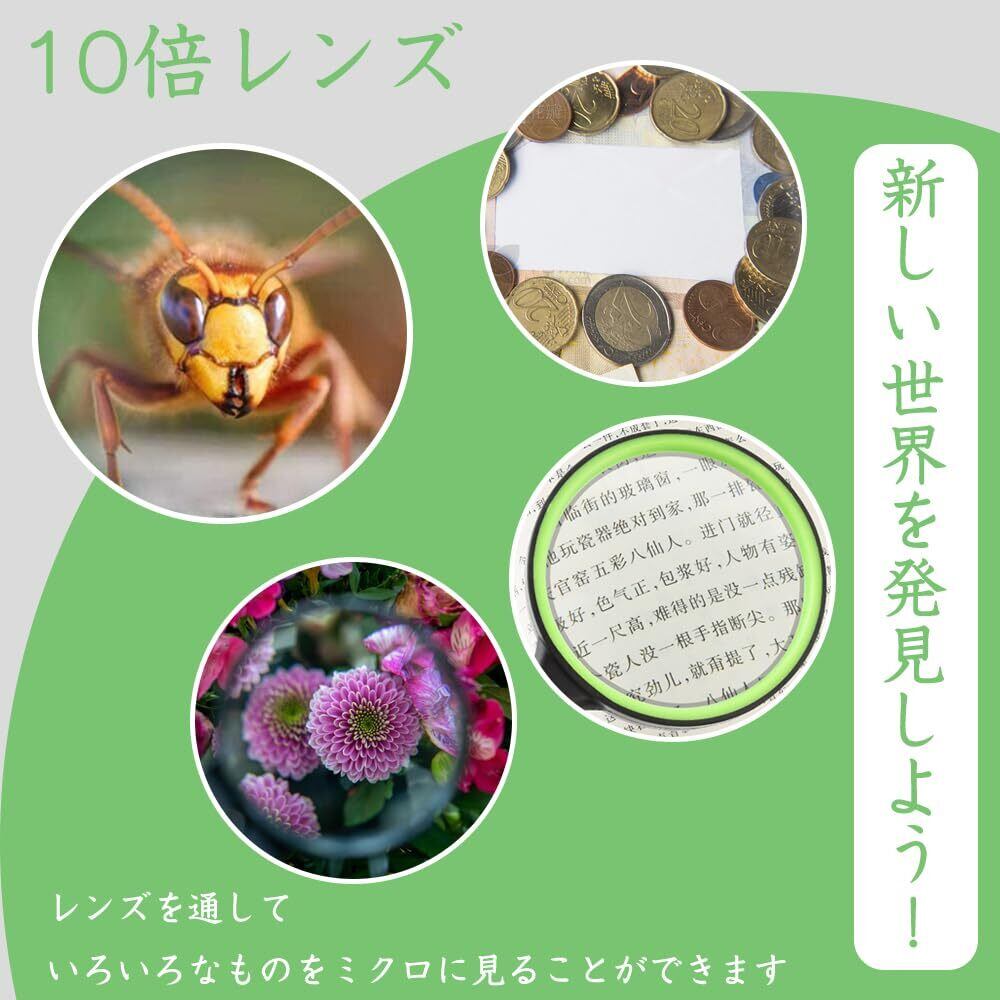 10倍拡大:本、地図、雑誌、新聞を見たり、昆虫、植物、宝石、コイン、工芸品などの細部を見るのに最適なアイテムです。