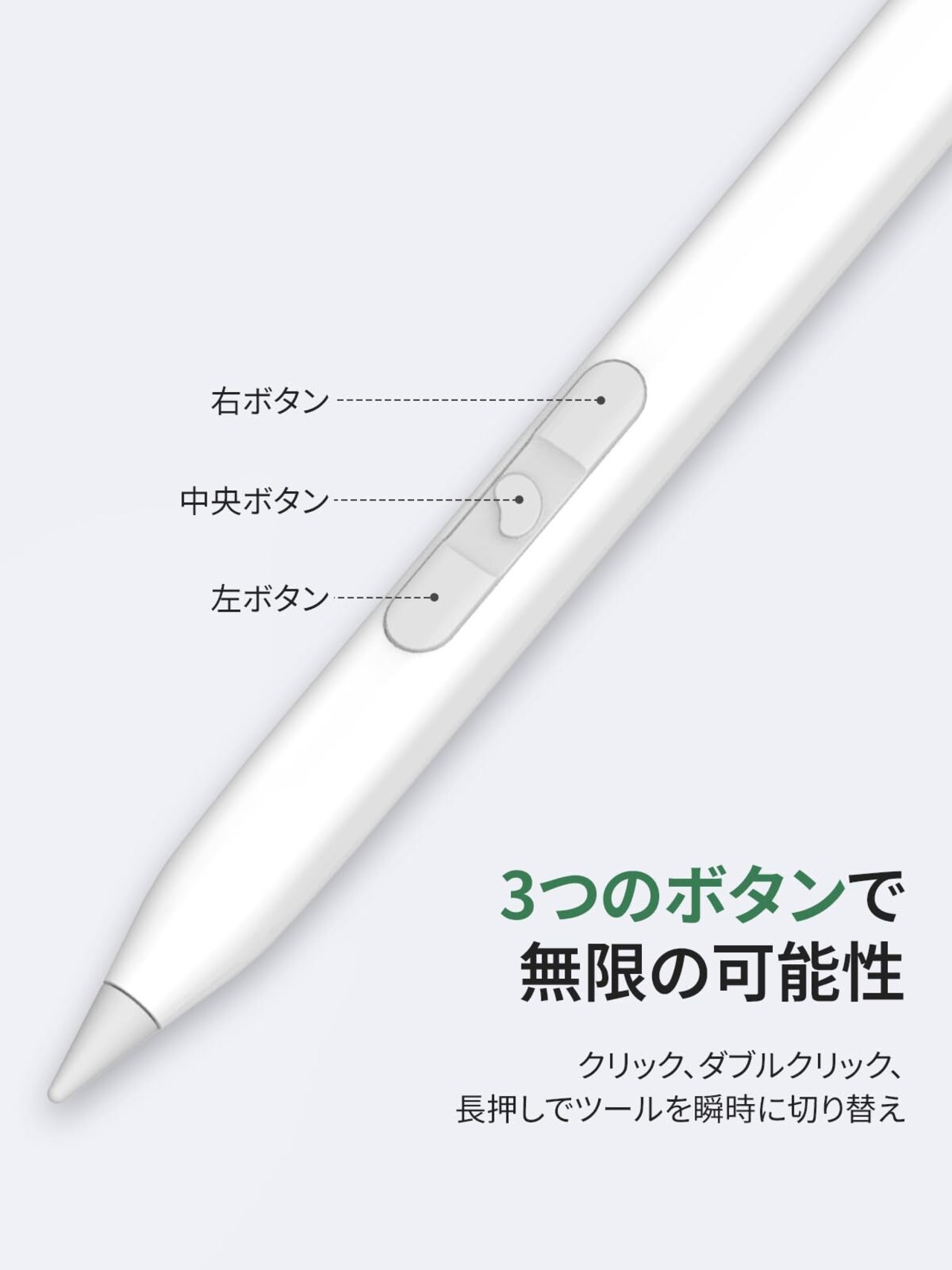 9つの多様なショートカット:3つの直感的なボタンで、GoodnotesとProcreateの9つの機能を操作できます。iPad上のメニューをタッチすることなくイラスト、消去、ハイライトが可能なタッチペンです。(クイックボタン機能にはBluetooth接続が必要です。)