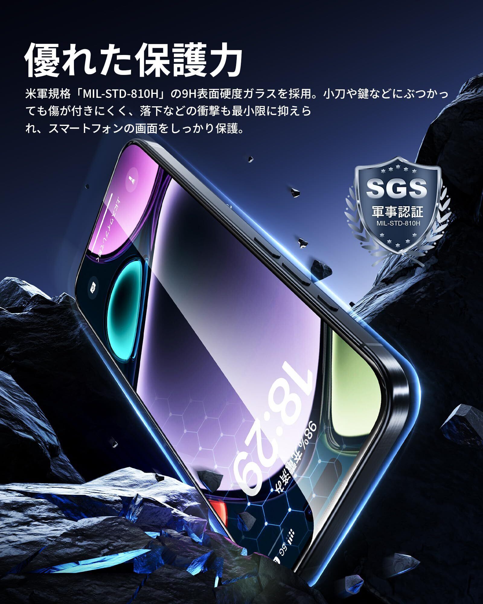 「米軍規格・傷や衝撃に強い」米軍規格「MIL-STD-810H」に準拠(認証番号:SZXEC23002005001)。9H表面硬度ガラスを採用しています。スマートフォンがカバンの中で、鍵などの鋭いものにぶつかっても傷が付きにくく、アイフォン16プロの画面をしっかり保護します。飛散防止加工により、万一割れてもガラス破片が飛び散ることなく安心です。