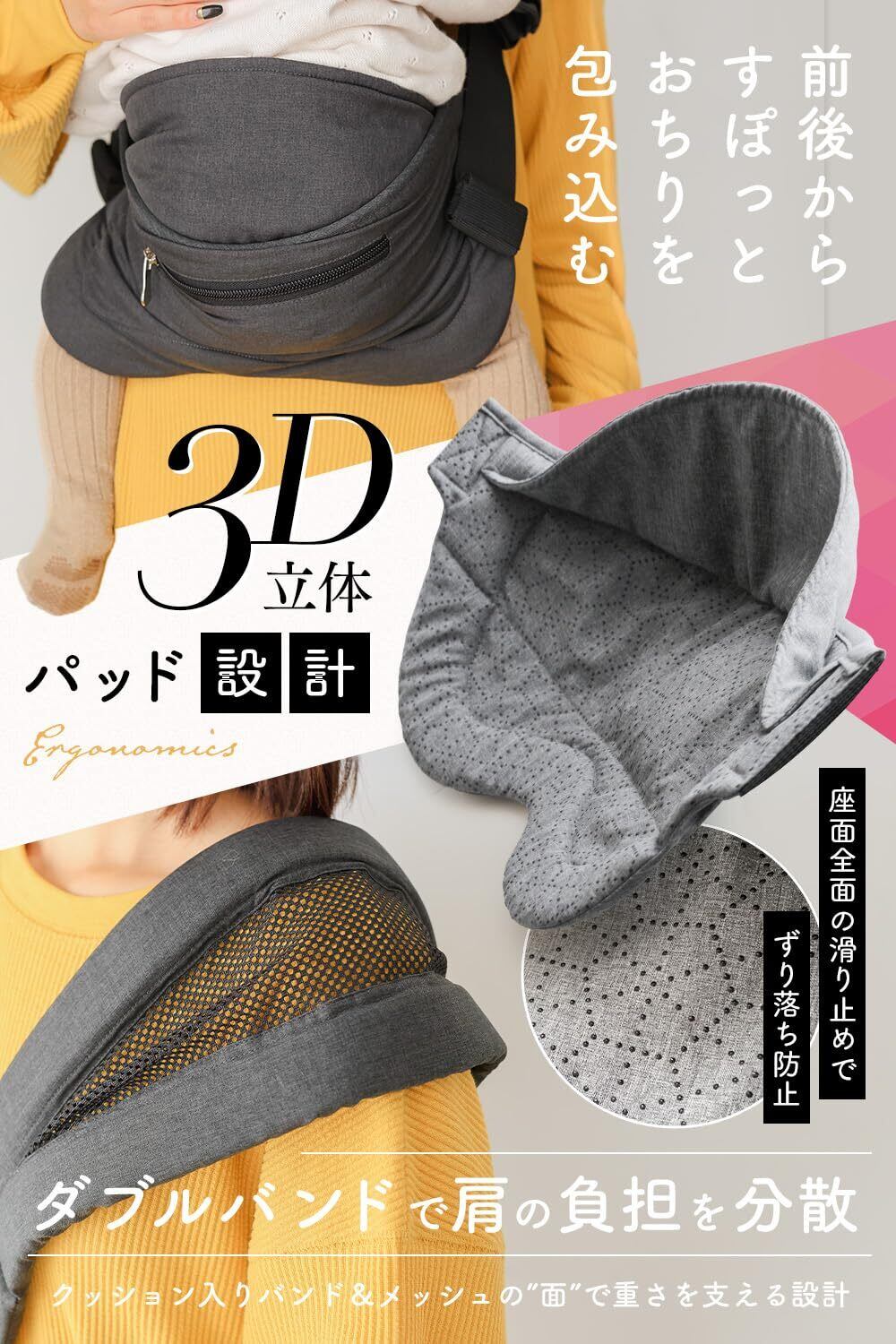 【滑り止め加工付き】 ベビースリング のパッド部分には細かいグリップつぶを敷き詰めまています これにより、ピタっとキャッチして、おしりがずれる心配もなくなります。