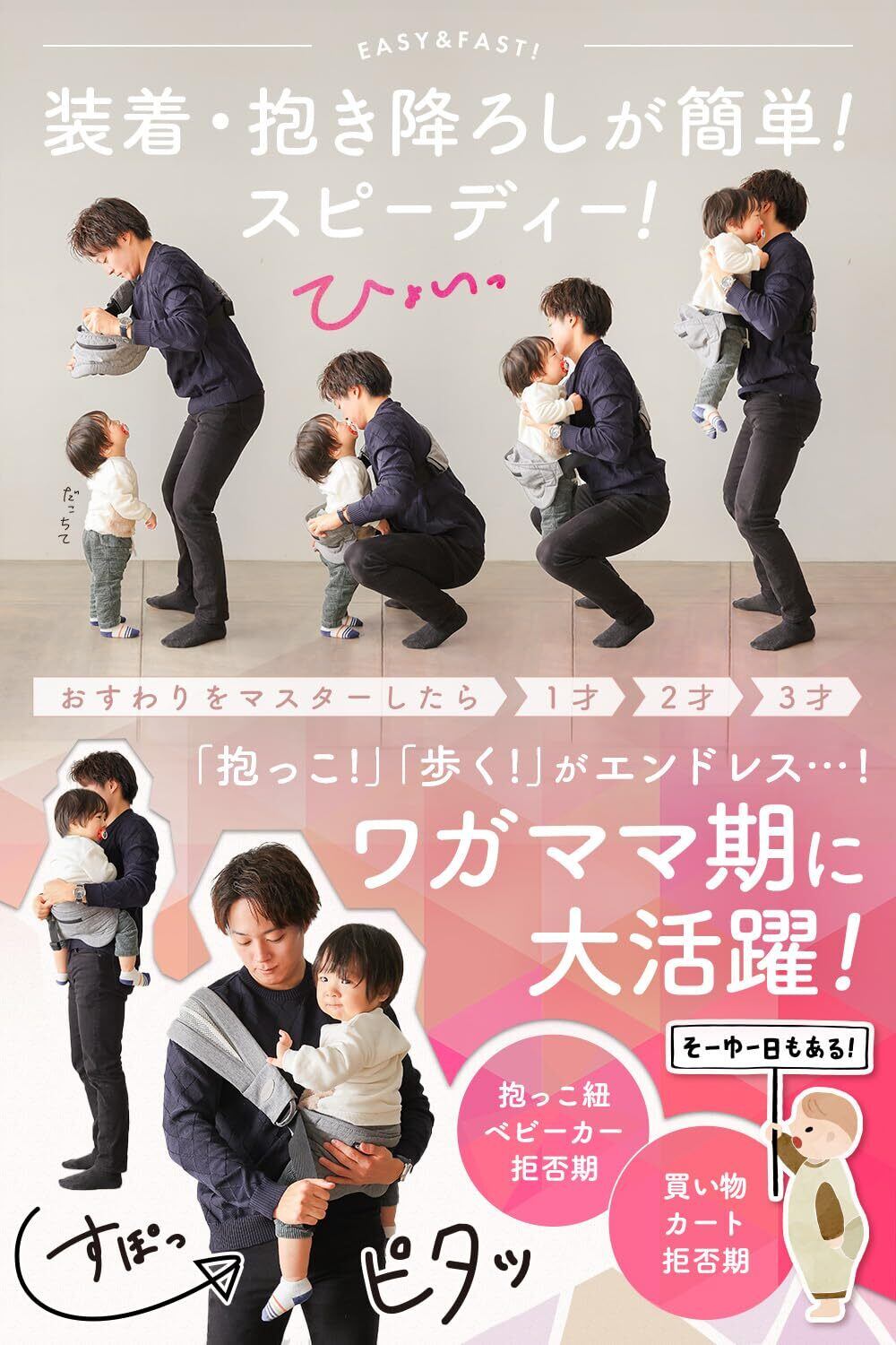 【安心・安全の耐荷重試験クリア】コペルタは耐荷重試験をクリアしており、しっかりとした作りで安心してお使いいただけます。赤ちゃんをしっかりと支えながら、パパやママも自由に動けるので、快適に育児を楽しめます。