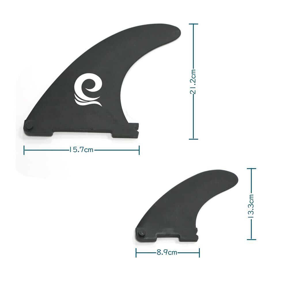 サイズ:センターフィン 15.7×21.2cm ,サイドフィン 8.9 x 13.3cm,ブラックが主体。主にインフレータブルパドルボードに使用されます。